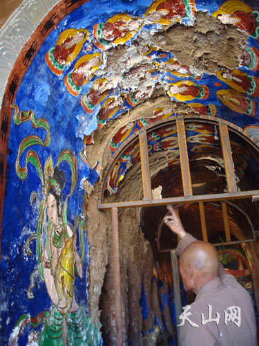 千佛洞当家和尚源成说手指洞窟顶部墙体跨塌处说, 多亏去年秋季做了两个铁制拱架支撑,不然今年整个南侧洞窟将都塌了