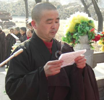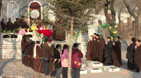 2008年4月4日,清明节,黑龙江省齐齐哈尔市大乘寺部分僧众及居士于早晨7点齐集妙公上人全身舍利塔前,举办祭祖扫塔法会。
