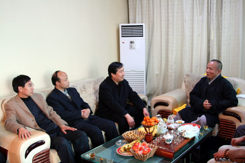 (陕西韩城市副市长梁军民(右二)、韩城市宗教局局长丁少全(左二)、副局长孟继与台湾首愚法师(右一)亲切交谈)
