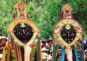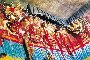 我们知道,藏族的悬挂面具作为佛教的保护神而存在于寺院,所以它的产生与佛教的兴起、寺院的建立密切相关。以日赞(山妖)、骷髅、帕姆(女鬼)、贴龙(独脚鬼)这些土生土长的低层鬼卒,也理直气壮一一进入佛教的护法行列。宗教在现今已知社会中普遍存在,但在有些民族尚属原始宗教,其特点是多神、无教义、无创始人。比如,藏族的“苯教”属原始宗教,由于久远的笨教信仰在吐蕃先民心中有着根深蒂固的地位,因而佛教和笨教在相当长的时间内处于并驾齐驱的局面。结果两种文化既相互竞争又相互融合,尽管最后佛教成为西藏的主流宗教,也因其对苯教文化的吸收而形成特色独具的藏传佛教。