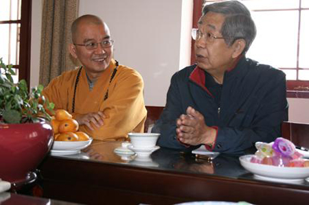 许嘉璐副委员长在学诚法师陪同下参观了寺院,并就寺院防火等安全问题进行了交谈。参观结束后至接待室座谈,许嘉璐副委员长与学诚法师就龙泉寺大殿设计等方面进行了交流。
