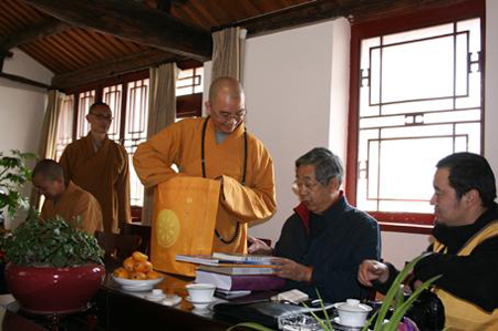 视察结束后,学诚法师赠送《电子大藏经》、《法炬》合订刊、《感悟人生》双语版光碟、博客书等礼品予许嘉璐副委员长。