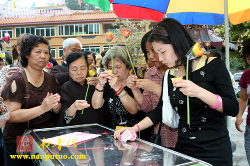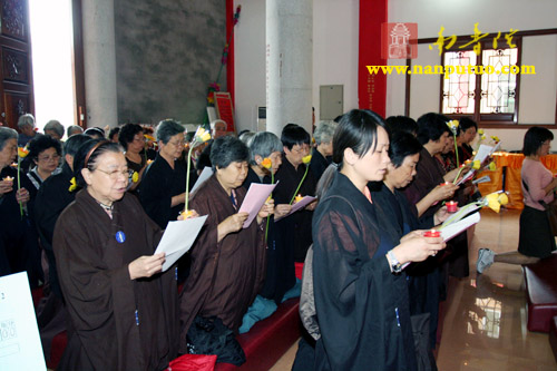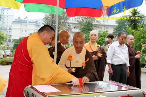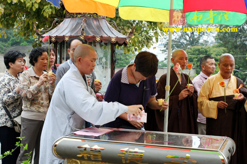 现场募捐的同时,僧俗大众冒雨点灯、献花祝祷,以表达对灾区人民的美好祝愿。最后,开敏法师代表全寺僧众对与会善信的慷慨解囊深表感谢。