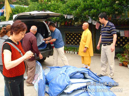 四川省佛教协会驻会工作人员将重庆市佛教协会捐来的帐篷等物资转交给彭州市佛教协会