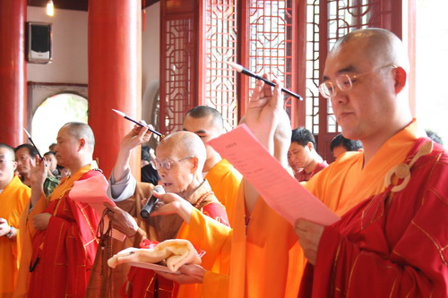 玉泉寺监院演通法师宣祈愿文,众僧祈愿颂经,表达了共同的祈福。