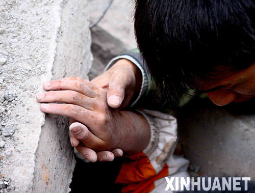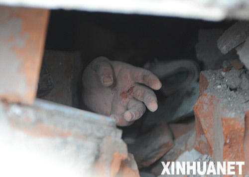 5月13日,在四川绵竹县汉旺镇一所中学内,一位被埋在废墟中的女学生伸出一只求援的手不停地呼唤着“救救我”。