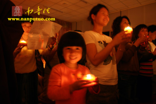 晚7时,庄严的梵唱响起,传灯法会开始。殿内人群济济,个个恭敬站立,低沉浑厚的唱诵声在殿堂内回荡,气氛庄严肃穆。虎溪岩寺监院净心法师慈悲为众开示,他说:传灯就是借灯灯相传,光光互照,让佛陀的慈悲传遍世界,甘露法雨洒遍全球,普世吉祥,社会祥和;同时也希望借传灯把佛陀的智慧和慈悲传递到大众心中,以佛法的光明之灯,破除心中的黑暗与烦恼,点亮自己的心灯,获得无限的温暖、安详、平安和欢喜。之后,大家跟随法师齐诵献灯祈愿文,幽幽烛光盛载着大家的祝福与心愿,传达着和平与美好。随着传灯活动接近尾声,音乐奏响,居士佛乐合唱团深情合唱《燃灯之歌》,让法会的气氛达到高潮。