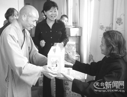 5月6日上午,市佛教协会护法慈善功德会会长月净法师一行在天台县宗教局、县民政局相关负责人的陪同下来到该县福利院,看望城镇“三无”老人和孤残儿童并奉上心意——饮料食品一宗。这些无子女、无法定义务赡养人、无生活来源的老人们紧紧握着月净法师的手,表示感谢,月净法师嘱托老人家多多保重。