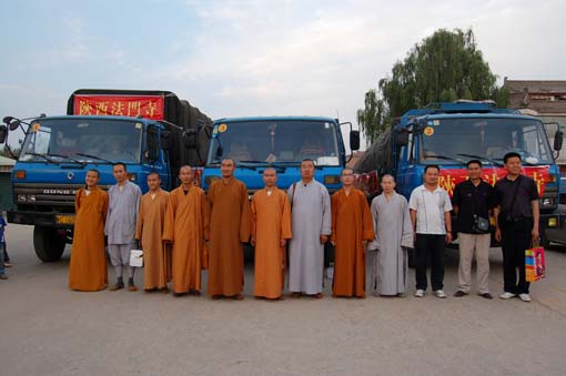 2008年5月22日,陕西法门寺为四川地震灾区捐赠456560元的赈灾物资,主要物资是灾区急需的帐篷、彩条布和药品,四部车队19时缓缓离开法门寺前往灾区。
