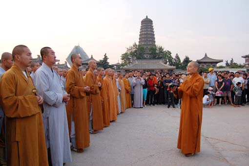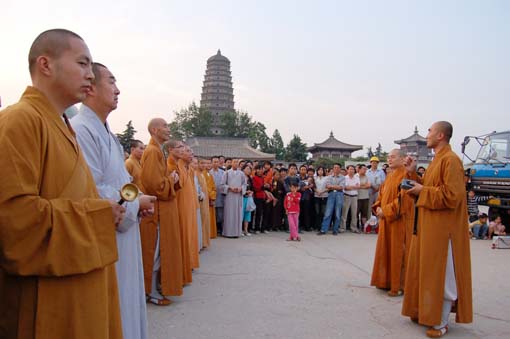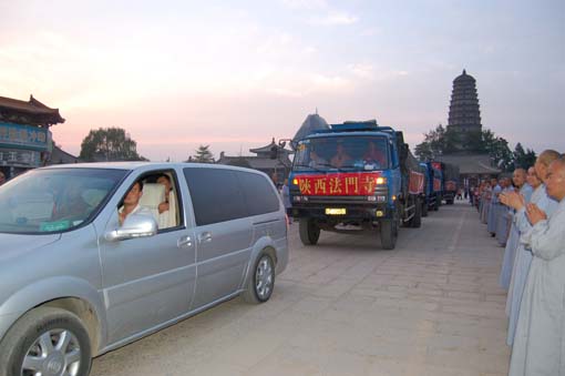 18时30分,法门寺主要执事智超法师、贤空法师、来正法师、洪利法师、陕西法门寺佛学院全体师生和法门镇的群众为赈灾车队送行,贤空法师向志愿者讲述了前往灾区的注意事项和团结合作的精神。贤空法师还说,12日的四川特大地震灾害牵动了每个人的心,13日法门寺僧众就举行了捐款和功德普佛法会,19日举行了第二次捐款、祈福、超度大法会,共捐款23万元,这次捐赠物资价值40多万元,希望这些物资给灾区人民带来温暖和信心。果清法师代表志愿者发表了讲话,我们将法门寺大慈大悲的精神带到灾区,一定完成好寺院交给我们的神圣使命。