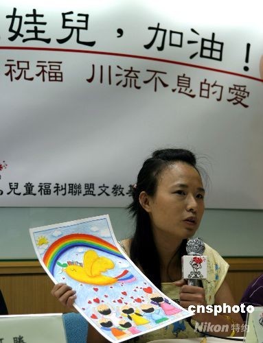 台湾儿童福利联盟五月二十一日在台北为四川灾区提出“受灾儿童安心三要诀”:要倾听,要安定,要游戏。二十六岁的“小怡”当年地震时还是初中生时,她辛苦度过失去双亲的成长过程,今天画画表达对四川灾区儿童的支持。