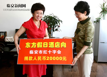 2008年5月8日,浙江省东方假日酒店的代表李小芳为支持临安红十字会“携手人道、关爱弱势”这一主题活动,向临安市红十字会捐款20000元,以表达她的爱心。