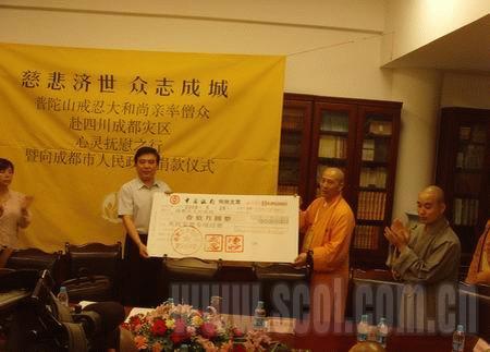 昨日,中国佛教协会副会长、浙江省佛教协会会长、普陀山佛协会长、普陀山全山方丈戒忍法师一行20人,奔赴我省地震灾区开展“心灵抚慰”活动,并现场向成都市捐赠100万。成都市副市长赵小维及成都市民宗局长赵璐等相关领导出席捐赠活动。