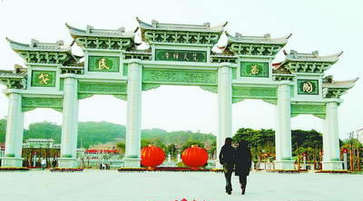 负责现场施工管理的老彭说,海沧青礁慈济宫的山门号称中华第一,跨度32米,比梵天寺的山门还多1.2米,但它的‘内胆’是钢筋水泥,只有外面才贴石材,不像梵天寺山门的所有构建是纯实心石材打造。因此,老彭认为,梵天寺石质山门是中华第一。它全是石头,但设计可以抗得住烈度为7级的地震。