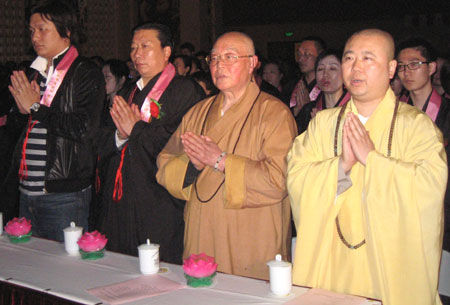 5月12日,上海玉佛寺内彩灯高悬,奥运五环旗和佛教五色旗随处可见,迎风飘扬。上海市各大寺院的代表云集于此,举行“上海佛教界为奥运祈福暨2008年佛诞节传灯”法会。上海市体育局、上海市民宗委、上海市佛教协会的有关领导以及运动员代表、上海各界护法居士千余人参加了法会。中国佛教协会副会长、上海市佛教协会会长、玉佛禅寺方丈觉醒大和尚代表上海佛教界上台致辞。表达了广大上海佛教信众对佛教传统的继承,以出世的精神做入世的事业,积极投入和谐社会共建的理念和决心,表达上海佛教界祈福国家繁荣稳定,祝愿奥运圆满成功的心愿。