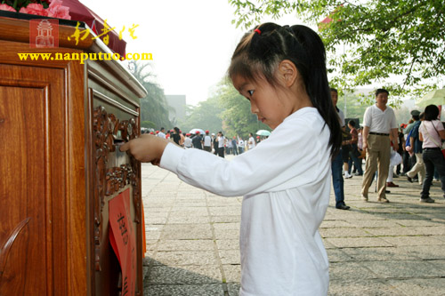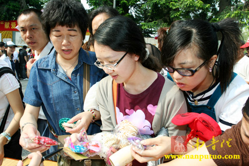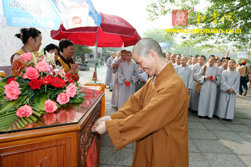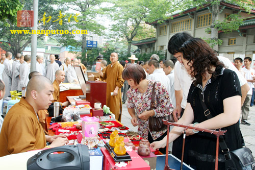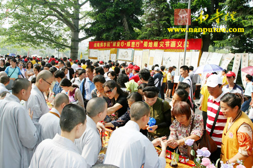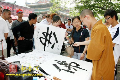 炎热的天气挡不住爱的脚步。5月18日,南普陀寺和海峡导报联合举办的赈灾捐款活动仍在继续,闽南佛学院“献爱心 慈悲行”蜀地赈灾书画义卖活动还在举行。上午8时许,南普陀天王殿前人潮涌动,闽院的师生来到了捐款义卖现场,厦大几名学生闻讯也特地赶来帮忙,信众、游客也都纷纷随喜参加爱心活动。