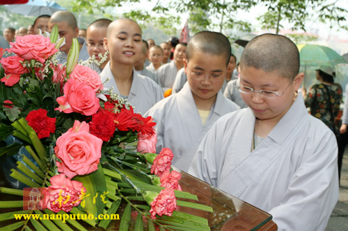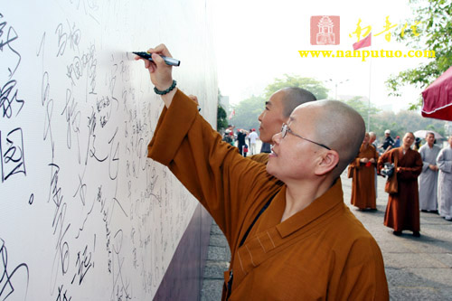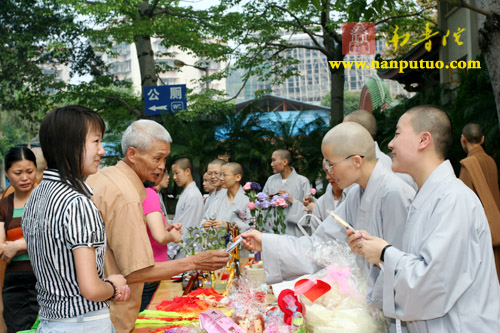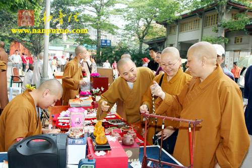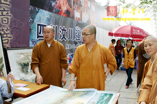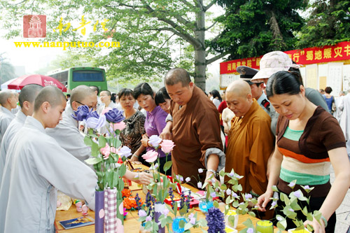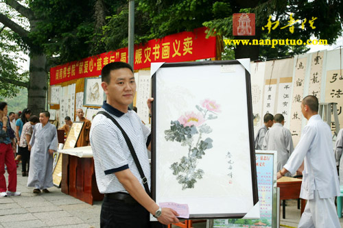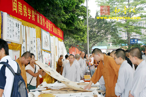 昨天(5月17日),是南普陀寺和海峡导报“赈灾捐款慈善箱”开通的第三天,共募得善款近25万元,其中来自社会各界爱心人士的捐款有19.0830万元,闽南佛学院书画义卖有5.877万元。群众捐款赈灾的热情大大地鼓舞了闽院师生和灾区人民一起战胜困难,尽自己最大努力帮助他们重建美好家园的决心。闽院教导长达源法师和几位班主任一大早就在指挥布置义卖现场,女众部的师生赶来参加捐款、义卖,师生们更是毫不犹豫地拿出自己珍藏的字画、工艺品、佛像、水晶塔、佛珠、挂饰、手工折花等种种精美物品(其中惟妙惟肖的手工折花是女众部学僧打着手电筒连夜赶制出来的);现场另有学僧在泼墨挥毫,手巧的女众学僧在编串挂饰,场面温馨、感人至深。