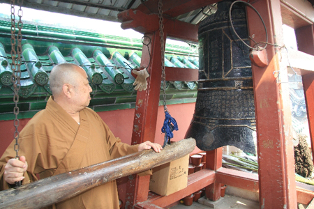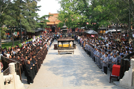 2008年5月19日14点28分,北京灵光寺僧众在佛牙塔上举行哀悼四川汶川大地震遇难同胞大法会。