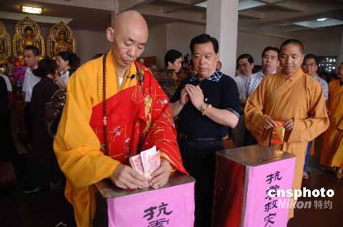 5月24日,历时三天的福州雪峰寺、万佛寺僧众为汶川特大地震受难同胞祈福法会,在福州闽侯万佛寺揭幕。在首场法会上,原福建省政协副主席金能筹(前排左二)、雪峰寺方丈释广霖(前排左一)等率众向灾区同胞捐款祈福。