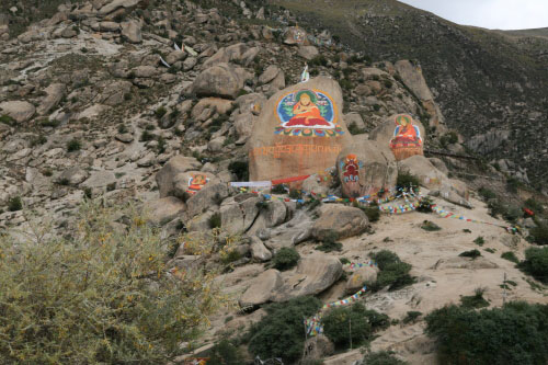 从哲蚌寺沿西侧的台阶拾级而上,进一个大门后的左侧是一条小路,旁边流水潺潺,经常会有一些藏族妇女在溪边洗铃铛。走上一个山间的小平台,可以俯瞰山谷的景色。继续往上走,左边远处有绘在山石上的佛像,后面的铁架子就是雪顿节时的晒佛台。每年雪顿节哲蚌寺都会举行晒佛仪式,在山坡上展示一幅巨型佛像唐卡,引来大批信徒和游客前来祷福,场面十分壮观。著名的甘丹颇章就在右边一处有很高台阶的地方。甘丹颇章大门前面有一个小佛殿,里面供奉着五世达赖喇嘛的衣服。甘丹颇章有3层,每个窗口都种了许多花。这里曾是二至五世达赖喇嘛居住的地方。后来五世达赖喇嘛掌管地方政权,在布达拉宫完成白宫部分重建后,便正式迁到了布达拉宫。由于达赖是在甘丹颇章建立政权的,所以史称”甘丹颇章王朝”。