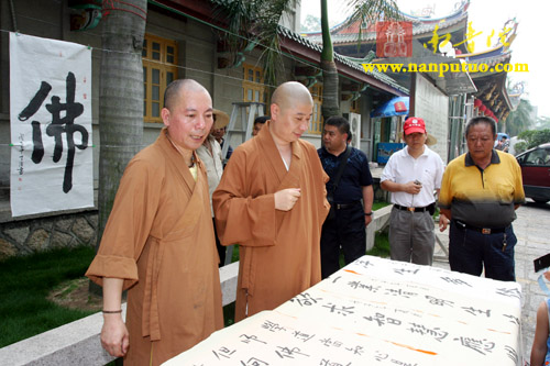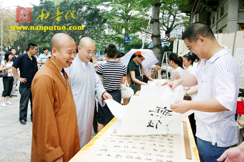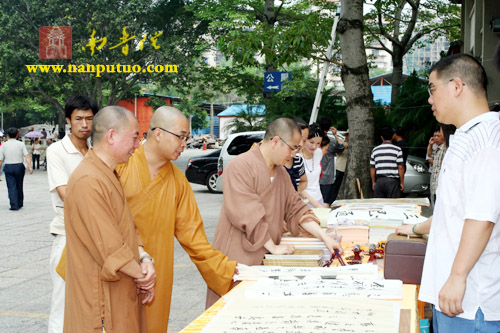 “5·12”四川汶川大地震已经过去十多天了,但由于地震而造成500多万老百姓无家可归、生活无依,有感于此,南普陀寺首座、闽南佛学院图书馆馆长了法法师在得知灾情的第一时间捐出5万元善款后,又于今日上午8时30分,在南普陀寺天王殿前举办个人书画作品赈灾义卖,为灾区人民再献爱心。