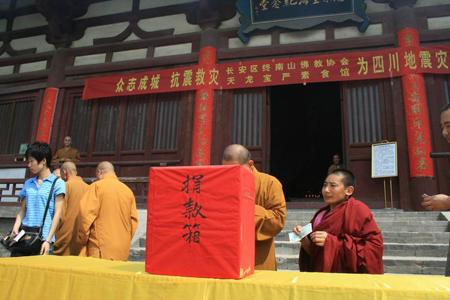 2008年5月14日上午,陕西省西安市青龙寺举办为四川汶川地震灾区救灾捐款仪式,来自长安区及西安地区佛教信众约500人在青龙寺为灾区捐款。长安区终南山佛教协会会长宽旭法师主持捐款仪式,并致辞表示希望四众弟子念佛回向,祈祷灾难早日结束。