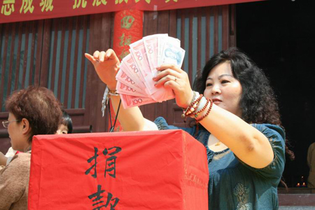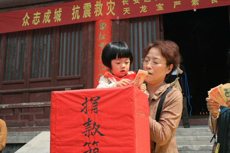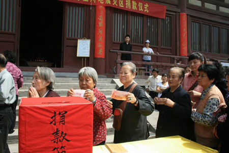 参加捐款仪式的有白发苍苍的老人,也有几岁的小孩,还有一位住在终南山上茅棚的比丘尼将自己刚刚领到的生活补贴也放到了捐款箱里。热烈的捐款仪式感动了所有在场参加者,也体现了广大佛教徒对灾区同胞的关心。