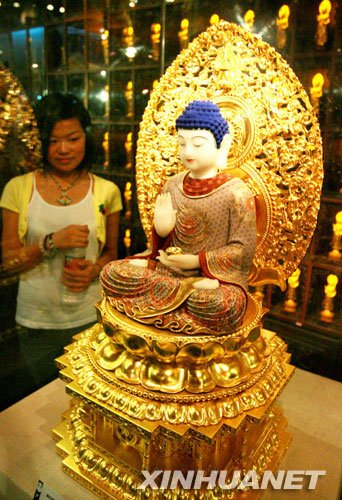 5月1日,一名游客被苏州首届佛教文化艺术展上的展品所吸引。