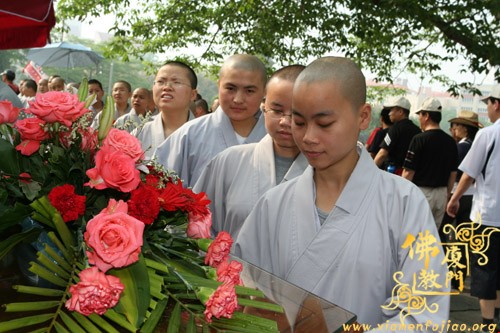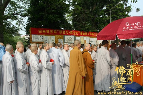 5月18日报道:南普陀寺和海峡导报联合举办的赈灾捐款活动第四天,闽南佛学院女众部280名学僧,排队到南普陀寺前参加捐款。今日善款箱收入11.2850万元。