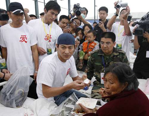 据香港媒体报道,刘德华及郑秀文(Sammi)等人昨日继续在四川灾区作探访,他们首先到达东方汽轮,那儿原是一个停车场,当地震发生后共死了五百多人,所以他们先默哀一分钟,然后才展开探访。之后他们便到绵竹临时医院,探访第一队到灾区救人的英雄,并与他们一起唱国歌。当医院的病人及医护人员见到他们到来,都显得好开心,纷纷上前跟他们握手,因而造成一阵骚动,期间有些婆婆未能起床,他们就到床前跟婆婆聊天。