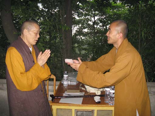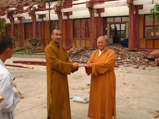 果清法师代表法门寺向广化禅院主持广海法师捐赠重建资金
