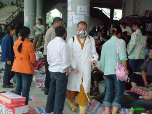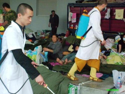 道坚大和尚带着他的弟子克忍法师在灾民安置点消毒