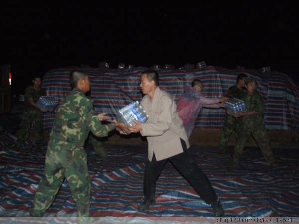 货物运达目的地的时候,已经是晚上9点多钟,当地政府领导和解放军官兵立即组织卸货,但是刚刚揭开篷布,第一车货才 卸了一半,天空就飘起了小雨,并且有越下越大的趋势,因为我们运来的是棉被,只好再次将篷布盖好,等待雨能够停下来。雨越下越大,这时我们内心非常着急,因为来的路上有一处泥石流塌方,如果雨继续下,那里根本就过不去,尤其是隧道附近,也是非常危险的地段,我们默默地祈求佛菩萨慈力加被,希望雨能够停下来,哪怕是停半个小时也好啊!奇迹出现了,雨 真的停了下来,我们赶紧联系官兵,继续卸货,时间一分一秒的过去了,半个小时后车上的货卸了三分之二,天空又下起了雨,我们默默祈祷,希望我们的救灾棉袄能够顺利卸完,官兵们也加快了进度,大家喊着口号,争分夺秒地卸载物质。丝丝雨滴,给疲惫的我们带来了凉意,在佛菩萨的加被下,我们的物质顺利卸完。