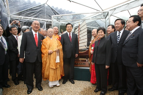 上午11时30分,正在日本进行国事访问的国家主席胡锦涛来到唐招提寺,向唐招提寺赠送仿唐海船模型“友谊之舟”并亲切会见了出席“鉴真精神论坛”的各位代表。
