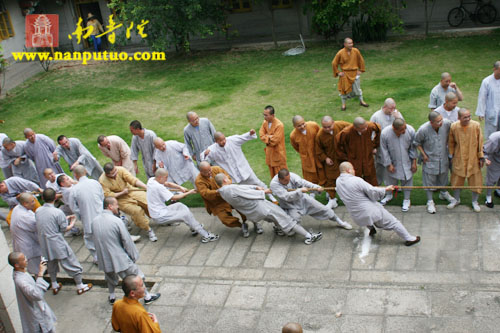 下午2时30分,举行拔河比赛。男众部所有的学僧都积极地参加了比赛,三个班级分成六个队,评委哨声一响,队员们竭尽全力向后拉绳子,双方实力相当,不分上下,围观的同学大呼加油,为各自的队伍助威呐喊,引来无数游客的驻足观看,并且不由自主地加入拉拉队中,最终预科班的同学取得了胜利。拔河比赛结束之后,又进行了猜谜语活动,大家动着脑筋思考谜底答案,很多同学捧着自己的战利品开心不已。