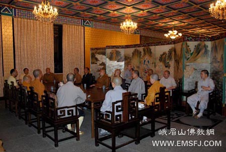 峨眉山佛教协会会长永寿法师、常务副会长传智法师、副会长心定法师、果正法师、演法法师、秘书长宏开法师以及全山各片区寺院的监院等执事参加会议。会议就峨眉山各寺院的抗震救灾工作作了部署安排,会议强调,在抗震救灾工作中,一切都要从安全的角度出发,做好防灾救灾以及消除各种安全隐患等一系列工作。会议还决定从5月13日起,峨眉山报国寺将暂停对外开放。