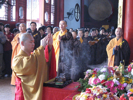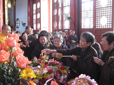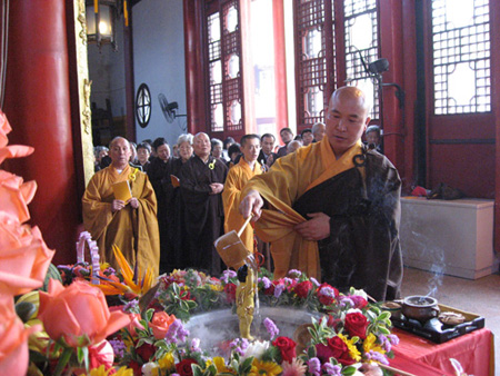 2008年5月12日,为庆祝释迦牟尼佛诞辰2552年,祈愿北京奥运圆满成功,社会安宁和谐,江苏省南京市栖霞古寺携四众弟子隆重举行浴佛法会。