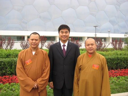 中国佛教协会教务部副主任清远法师与全国青联秘书长安桂武和见忍法师在奥运游泳馆水立方合影