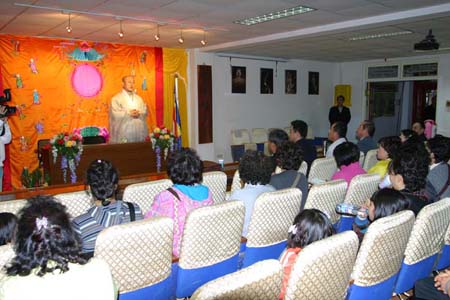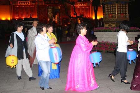 2008年5月12日,天津荐福观音寺内张灯结彩,花团锦簇,一派节日喜庆气氛。晚七时,韩国在津韩侨一行60余人在德润法师的带领下,到荐福观音寺千佛宝塔前举行庆祝本师释迦牟尼佛圣诞提灯行进仪式。法会得到住持妙贤法师及寺院50余位法师的热情欢迎和接待,中韩两国佛教徒共庆佛诞、法喜充满。