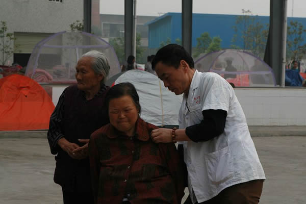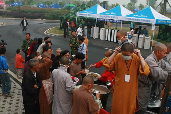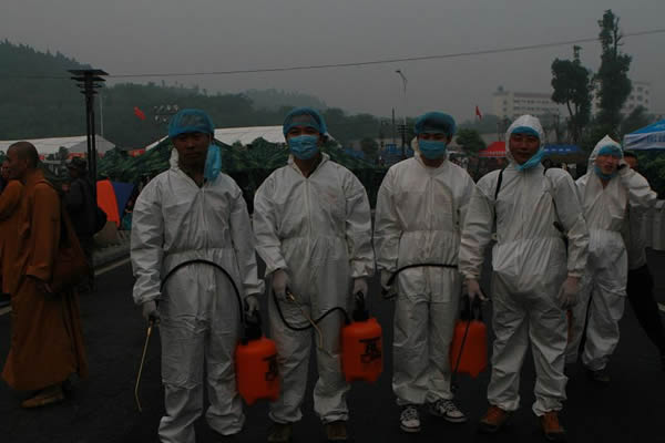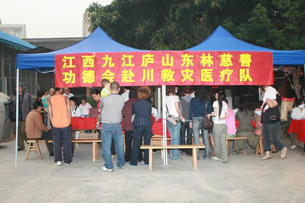2008年5月23日,星期五距离四川地震发生已有十一天,绵阳的天气一扫阴霾,光煦回返。我们从南坝回来在金祥寺安顿好了以后,稍作调整,便开始了新的赈灾工作。23号的日程安排的非常紧凑,我们各自的分工也十分明确:功德会的医务人员就近在金祥社区的一处灾民聚集地展开义诊;功德会的志愿者则安排在绵阳市区的九洲体育馆从事消毒防疫工作;东林寺的几位法师负责施粥送饭给当地灾民;另外的一部分志愿者则负责后勤工作并为灾民做饭煮粥。