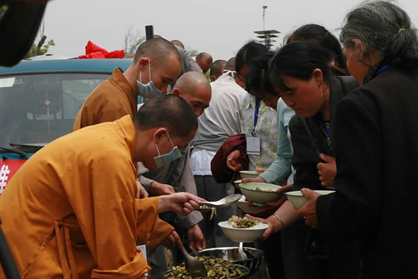 辛苦发放饭菜的法师们