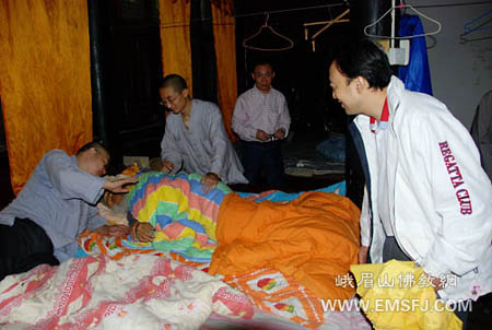 2008年5月13日,四川省宗教局杨伯明副局长在峨眉山佛教协会会长永寿法师、副会长心定法师、演法法师、秘书长宏开法师等的陪同下,视察峨眉山受灾情况,并指导抗震救灾工作。