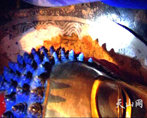 吉木萨尔千佛洞卧佛窟卧佛上部墙面残留有古代壁画图形图案清晰可见