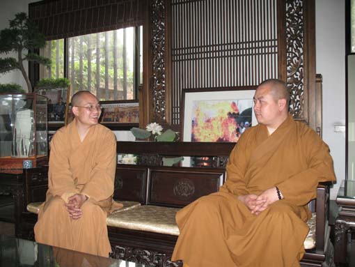 法门寺副监院、佛学院教务长和省佛协秘书长宽旭法师亲切交谈