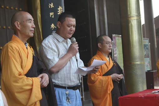 上午9时,全体僧众诵经祈福,智超法师、贤空法师、洪利法师、高军副县长、刘龙科宗教局长先后拈香祈愿。诵经结束后智超、高军分别做了重要讲话,法会由贤空主持并致词。参加法会的有法门寺全体僧众、佛学院全体师生、法门寺全体职工、居士和游客二百多人。大家慷慨解囊,纷纷向灾区人民捐款,伸出援救之手,仅半小时个人捐款合计36000多元。法门寺常住捐款20万元,分别由北京仁爱基金会、陕西扶风县民政局转交给灾区人民。