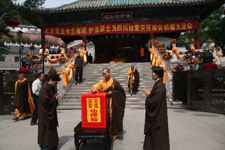 2008年5月15日上午,北京灵光寺方丈常藏法师紧急传达中国佛教协会关于“佛教界积极行动起来,支援地震灾区”精神,并与当日举办为四川地震灾区消灾祈福法会及募捐活动。祈福法会由灵光寺座元演道法师主法,为地震灾区罹难者超荐,为受难者募捐祈福。灵光寺念佛团及护法团居士热忱随喜法会。