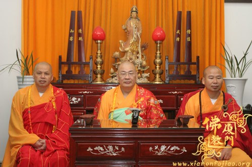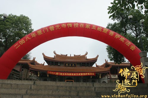 5月10日报道:厦门普光寺启建迎奥运、庆佛诞、感恩母亲传授在家菩萨戒法会,弘扬圣教,宣流正法。礼请中国佛教协会副会长、闽南佛学院院长、南普陀寺法主圣辉大和尚为菩萨戒得戒和尚,市佛教协会常务副会长定恒法师为羯磨阿阇黎,闽南佛学院教务长传明法师为教授阿阇黎,普光寺住持传建大和尚为依止和尚。