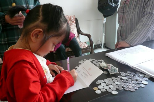 6岁的小菩萨在奶奶的带领下,拿着自己的储钱罐来佛教协会捐款.