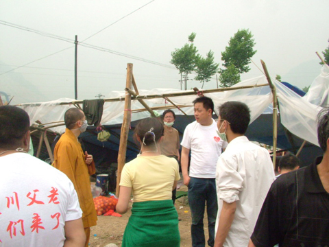 “北川父老,我们来了”道坚法师在雷鼓镇开展救援工作,并向该镇镇长(图中女士)了解灾情。