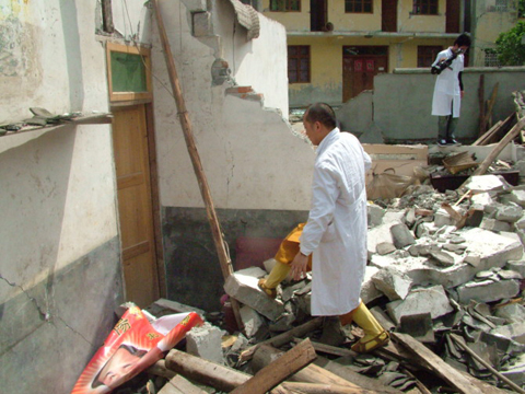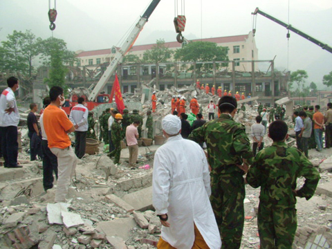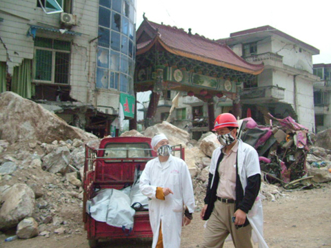 道坚法师深入灾情一线,了解灾区救援情况。(背景为北川县城大门,已严重变形)